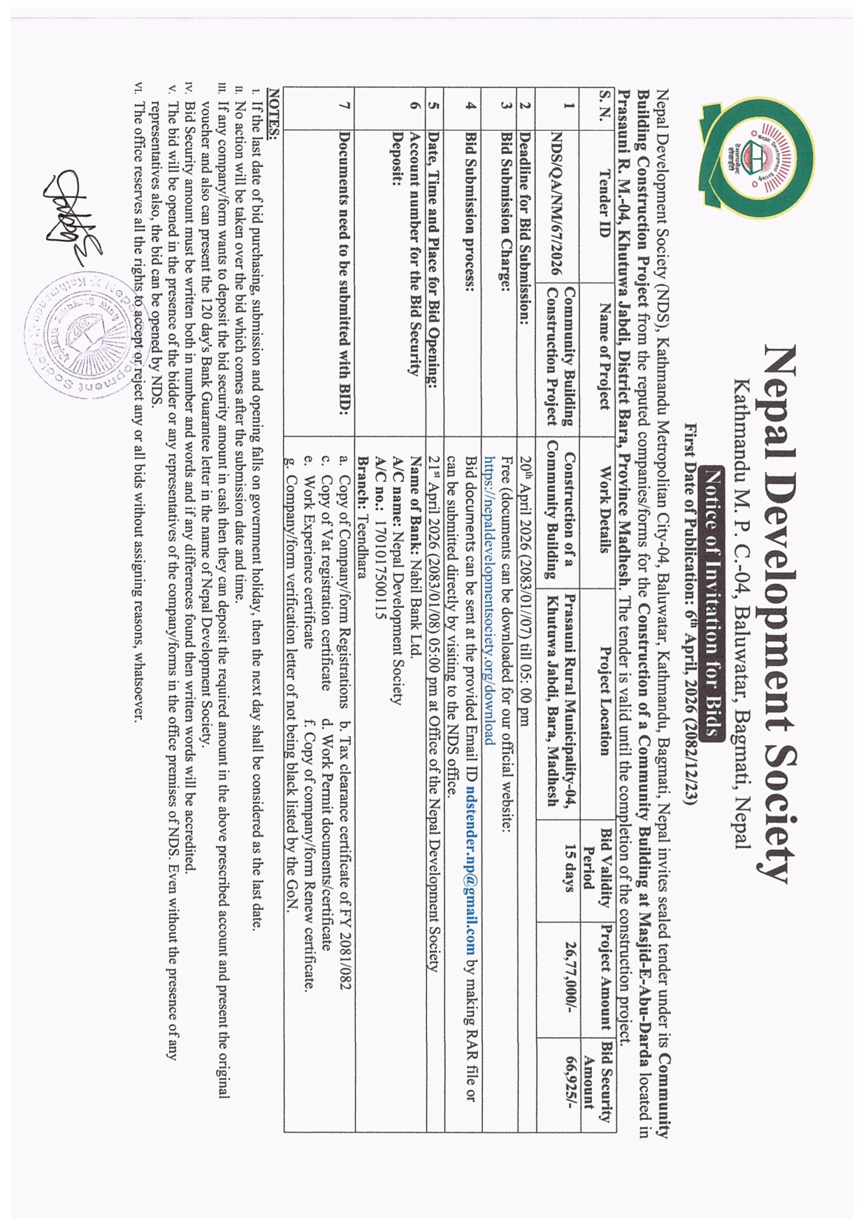 Tender No.: NDS/QA/NM/67/2026 Name of the Project: Community Building Construction Project Work......